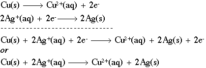 Here, two silver ions (silver with a positive charge) are being reduced through the addition of two (2) electrons to form solid silver. The abbreviations "aq" and "s" mean aqueous and solid, respectively. We can now combine the two (2) half-reactions to form a redox equation: