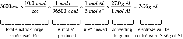 ![]() An external electric current hooked up to an electrochemical cell will make the electrons go backwards. This process is called electrolysis. This is used, for example, to make something gold plated. You would put the copper in a solution with gold and add a current which causes the gold ions to bond to the copper and therefore coating the copper. The time, current, and electrons needed determine how much "coating" occurs. The key to solving electolysis problems is learning how to convert between the units. Useful information: 1 A=1 C/sec; 96,500 coulombs can produce one (1) mole of e-; the electrons needed is determined by the charge of the ion involved Example Problem: If you are trying to coat a strip with aluminum and you have a current of 10.0 A (amperes) running for one hour, what mass of Al is formed? The solution of this problem involves a lengthly unit conversion process: