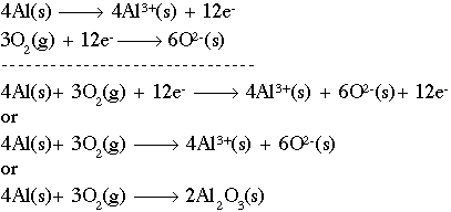 ![]() If we combine those two (2) half-reactions, we must make the number of electrons equal on both sides. The number 12 is a common multiple of three (3) and four (4), so we multiply the aluminum reaction by four (4) and the oxygen reaction by three (3) to get 12 electrons on both sides. Now, simply combine the reactions. Notice that we have 12 electrons on both sides, which cancel out. The final step is to combine the aluminum and oxygen ions on the right side using a cross multiply technique: