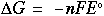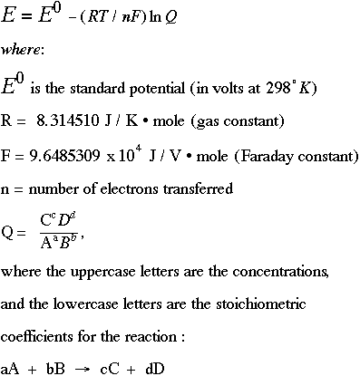 One of the more useful calculations in redox reactions is the Nernst Equation. This equation allows us to calculate the electric potential of a redox reaction in "non-standard" situations. There exist tables of how much voltage, or potential, a reaction is capable of producing or consuming. These tables, known as standard potential tables, are created by measuring potential at "standard" conditions, with a pressure of 1 bar (≅1 atm), a temperature of 298° K (or 25° C, or room temperature) and with a concentration of 1.0 M for each of the products. This standard potential, or E°, can be corrected by a factor that includes the actual temperature of the reaction, the number of moles of electrons being transferred, and the concentrations of the redox reactants and products. The equation is:
