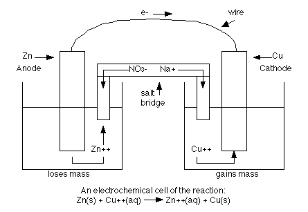 If a reaction is spontaneous, it will have a positive Eo, and negative ΔG, and a large K value (where K is the equilibrium constant-this is discussed more in the kinetics section). The energy released in any spontaneous redox reaction can be used to perform electrical work using an electrochemical cell (a device where electron transfer is forced to take an external pathway instead of going directly between the reactants. Think of the reaction between zinc and copper. Instead of placing a piece of zinc directly into a solution containing copper, we can form a cell where solid pieces of zinc and copper are placed in two different solutions such as sodium nitrate. The two solids are called electrodes. The anode is the electrode where oxidation occurs and mass is lost where as the cathode is the electrode where reduction occurs and mass is gained. The two electrodes are connected by a circuit and the two (2) solutions are connected by a "salt bridge" which allows ions to pass through. The anions are the negative ions and they move towards the anode. The cations are the positive ions and they move towards the cathode. The following is a diagram of an electrochemical cell with zinc and copper acting as the electrodes.