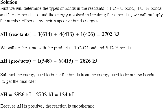 Given the following bond dissociation energies (H-C is 413 kJ/mol; H-H is 436 kJ/mol; C=C is 614 kJ/mol; C-C is 348 kJ/mol), determine dH for the reaction: