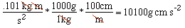 Force is usually measured in Newtons (N= kg m/sec^2), but some scientists use dynes instead (dyn = g cm/sec^2). Convert 0.101 N to dynes.